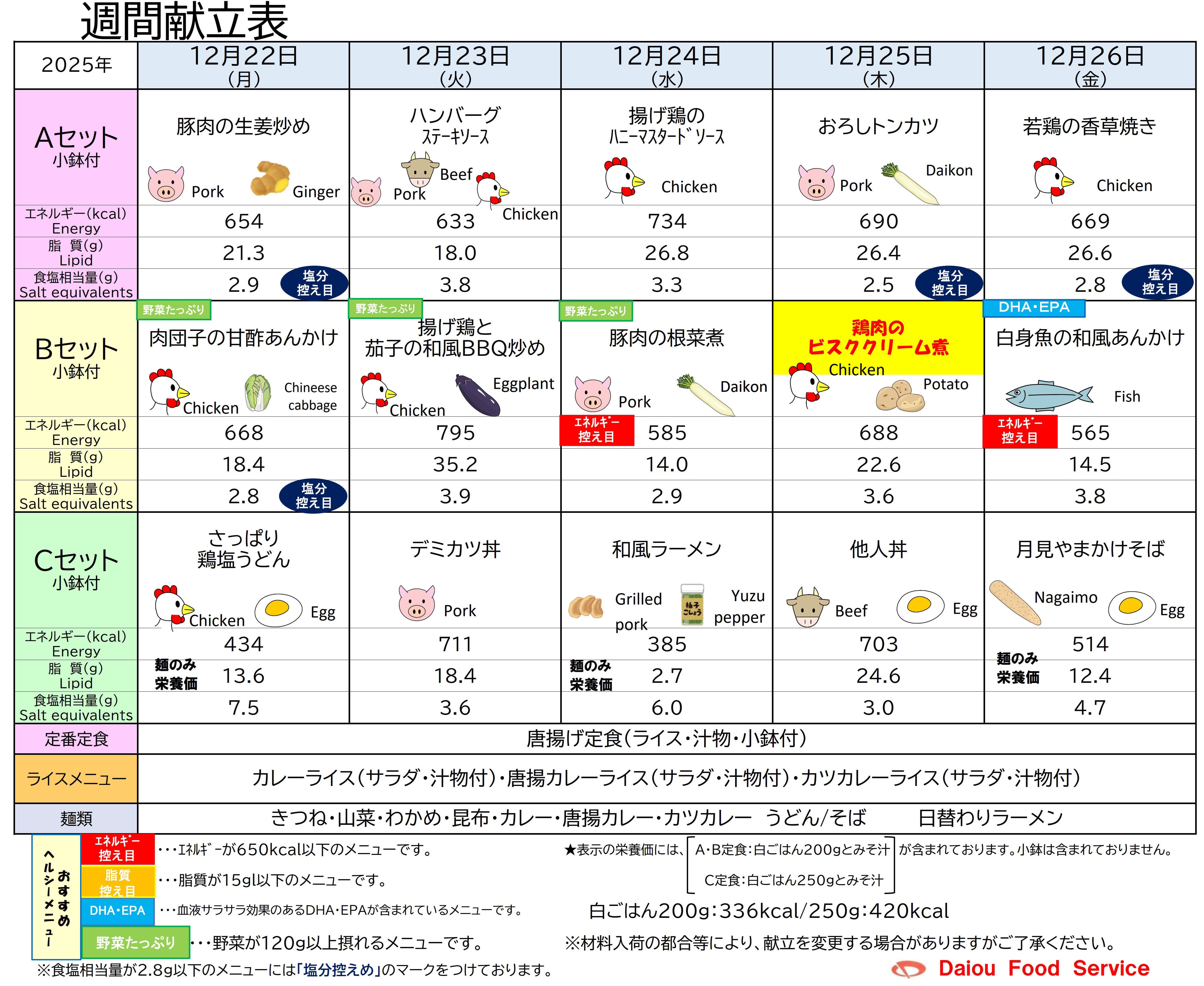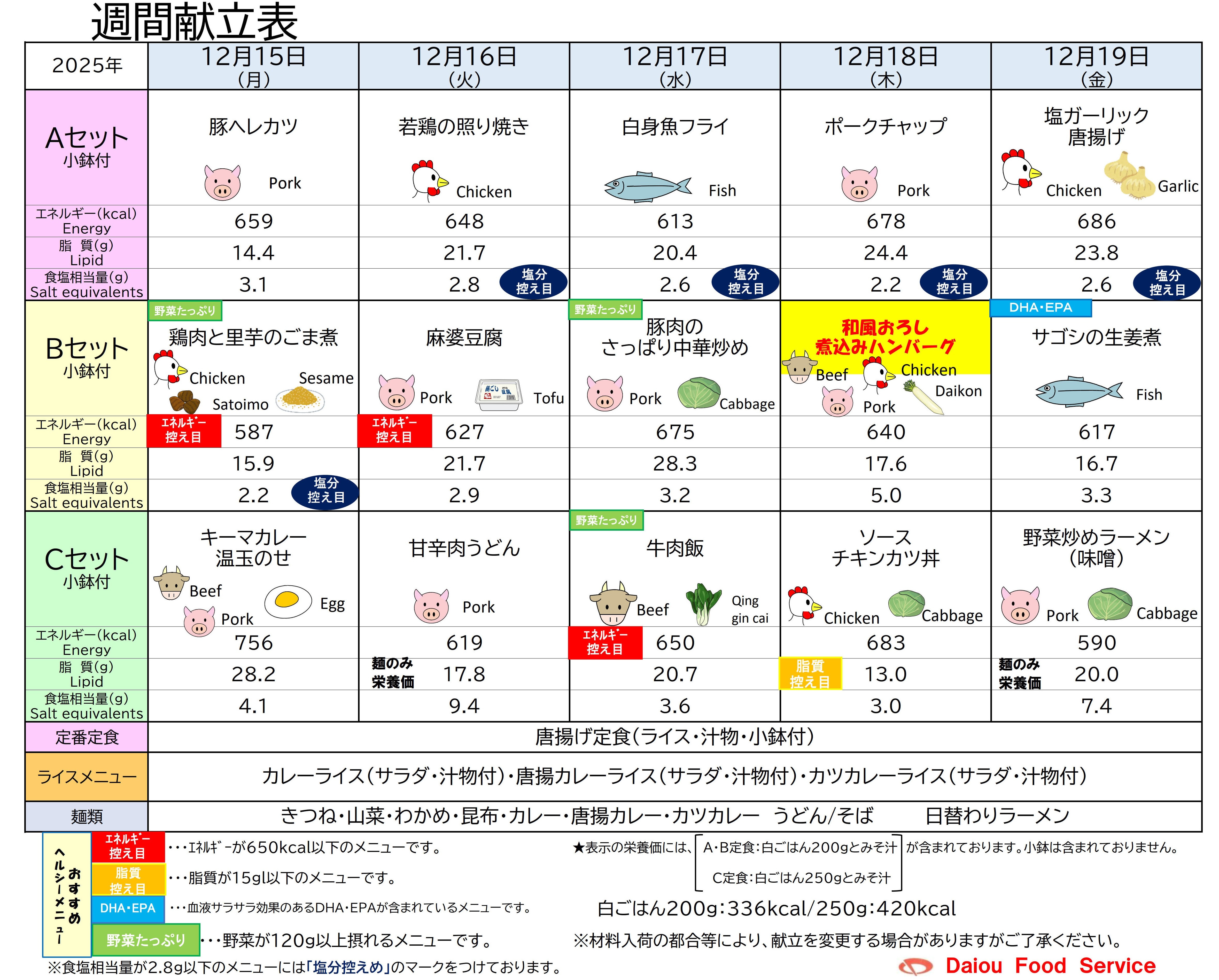 メニューには、カロリーなどの数値を掲げるとともに、エネルギー控え目、脂質控え目、野菜たっぷりなど一目で分かるように表示しています。